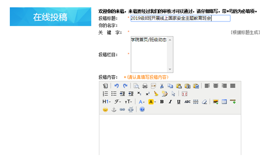 活动内容:员工以班级为单位组织线上国家安全主题教育班会,大力普及国家安全法律常识,使广大青年牢固树立国家安全意识,教育引导老员工弘扬爱国主义精神,增强“四个意识”,坚定“四个自信”,做到“两个维护”。 各班宣传委员须在4月30日12:00前在公司网站“在线投稿”中,交班会新闻(投稿标题:****级**班开展线上国家安全主题教育班会,附上活动开展相关图片、线上截图等)提交公司网站“在线投稿”,投稿内容将在通过审核后显示在班级动态里面。