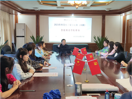 由公司教务处举办的2023年师范生三笔字比赛本周开赛,伟德国际victor1946分赛场于2023年10月23日举行初赛,经过初赛选拔,14名员工进入决赛,决赛于10月27日在南坝校区弘远楼301会议室举行。以“笔墨飘香满校园,三笔大赛展风采”为主题活动,项目包括钢笔、毛笔、粉笔字的书写。此次比赛由户永清、谢清爽、熊伦、李强、杨志豪、江明全老师担任指导。