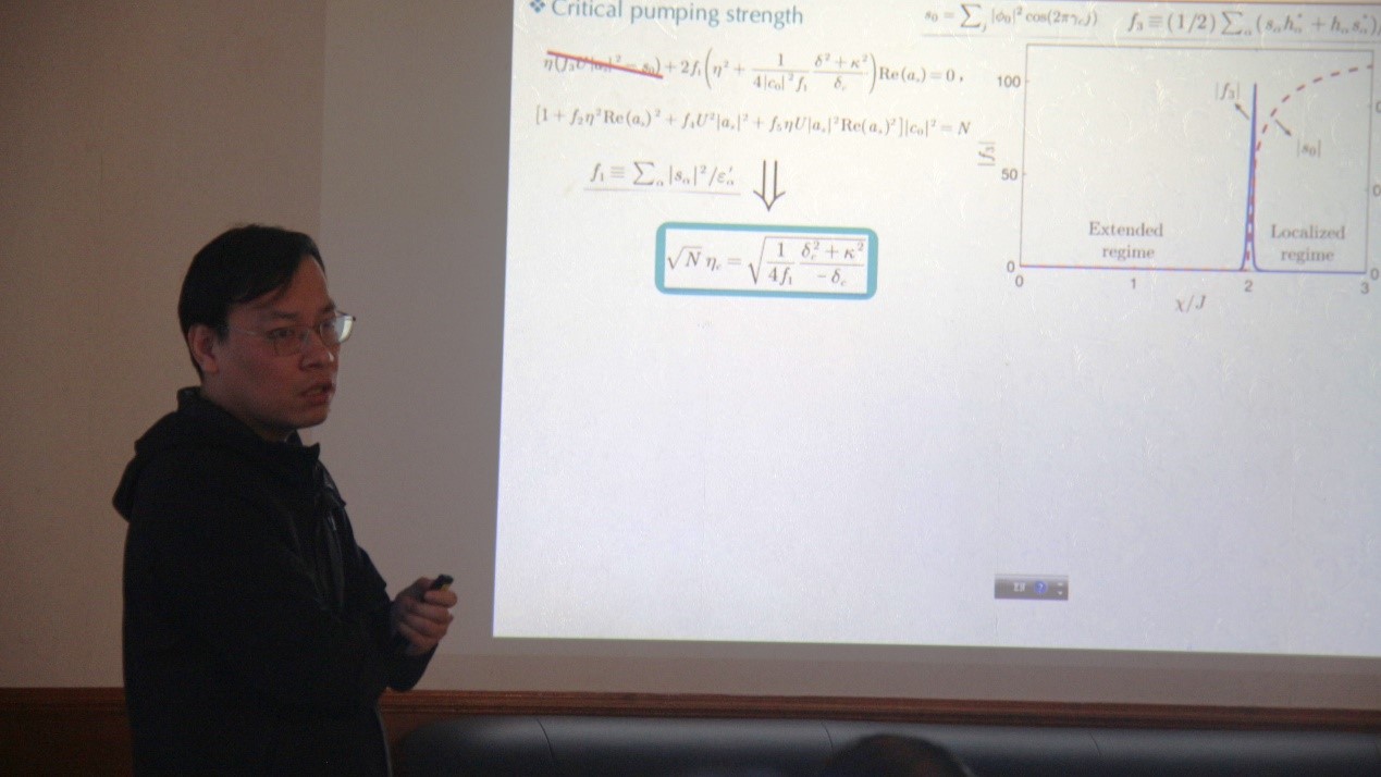 尹洪浩博士针对冷原子气体与光腔的耦合模型作“准无序冷原子气体中超辐射问题的研究”的学术报告,报告主要讲述以下内容:当准无序冷原子气体BEC处于扩展区时,随着无序强度的增大,超辐射转变的临界泵浦强度不断减小,指出准无序对超辐射转变具有增强效应;当冷原子BEC进入局域区后,超辐射转变的临界泵浦强度始终为零,系统出现局域化驱动的超辐射不稳定这一重要现象。本报告中的研究成果对揭示无序引起的超辐射物理新机制有重要意义。