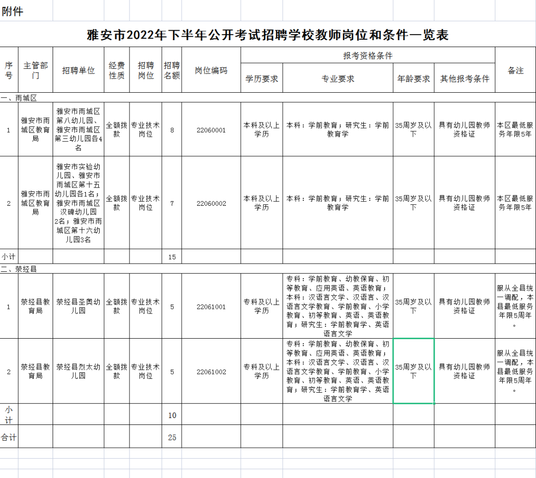 本次公开招聘公司教师名额共计25名,具体招聘单位、岗位、名额及报考资格条件详见《雅安市2022年下半年公开考试招聘公司教师岗位和条件一览表》。
