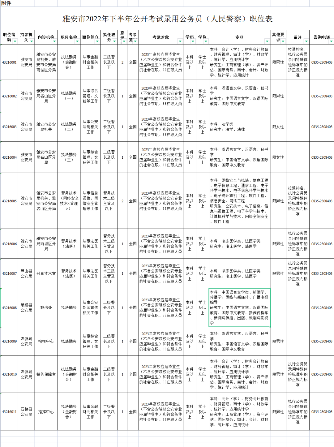 附件: 雅安市2022年下半年公开考试录用公务员(人民警察)职位表