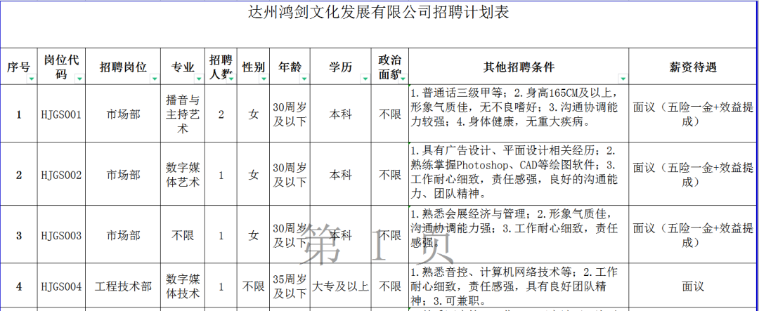 本次招聘涉及岗位17人。具体岗位及要求等详见附件《达州鸿剑文化发展有限公司招聘计划表》。