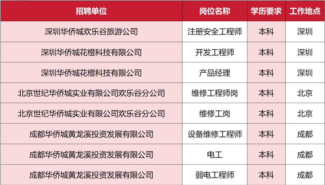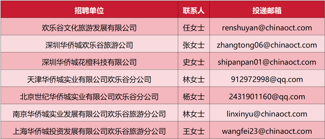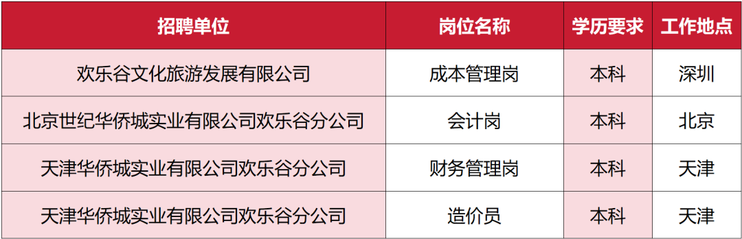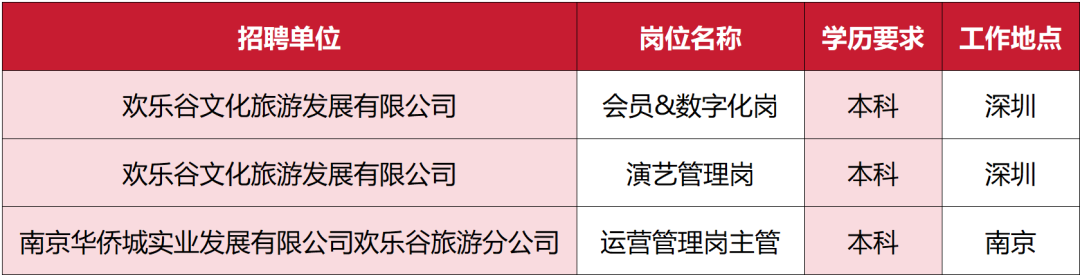 本次欢乐谷公司本部及所属企业招聘若干人,包括中层管理类、财务成本类、品牌营销类、运营管理类、专业技术类、综合管理类岗位,具体岗位职责、人数和岗位要求等信息详见《欢乐谷公司本部及所属企业招聘需求表》(扫描文末二维码)。