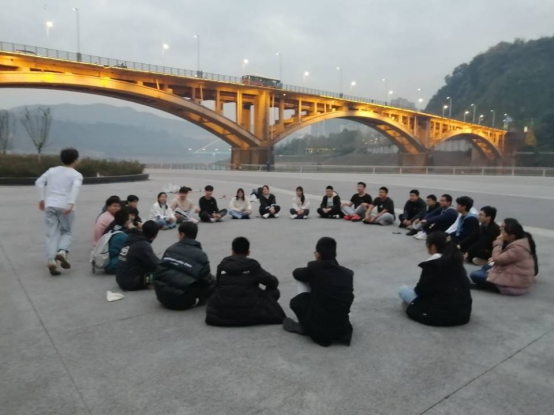 在这灯火灿烂的大桥之下,大家开始玩丢手绢游戏(在BGM氛围下,丢在玩家背后开始跑,若被追上,则受到处罚;若到空位置之前没被追上,则另一个人受惩罚),伴随着大家的欢声笑语,团日活动逐渐接近尾声。本次团日活动,大家尽显自己的歌声和舞姿,可谓是各显神通,多才多艺!快乐的时光总是过得很快,相聚虽短,但同学们的情谊无限长。