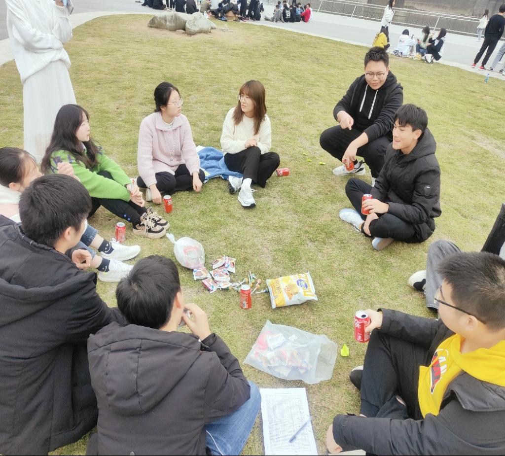 活动中,全班同学合为一组进行丢手绢游戏,被追上的人须在中心接受抽卡片的惩罚。在这之后全班同学集体参加了123木头人的游戏,根据过关时间累计分数,并根据最终得分获得奖品。在游戏过后,大家都有些疲惫,因此聚集在一起享受食物,分享自己的故事。