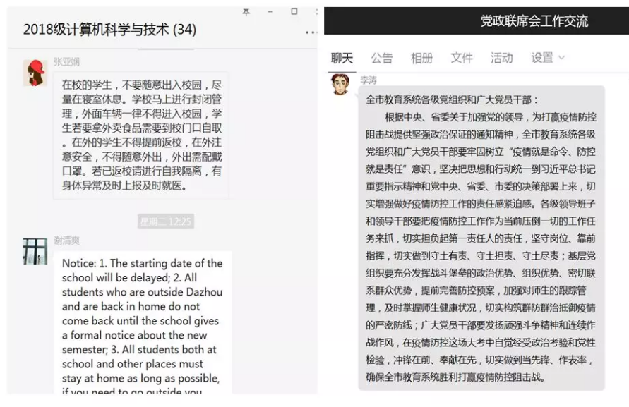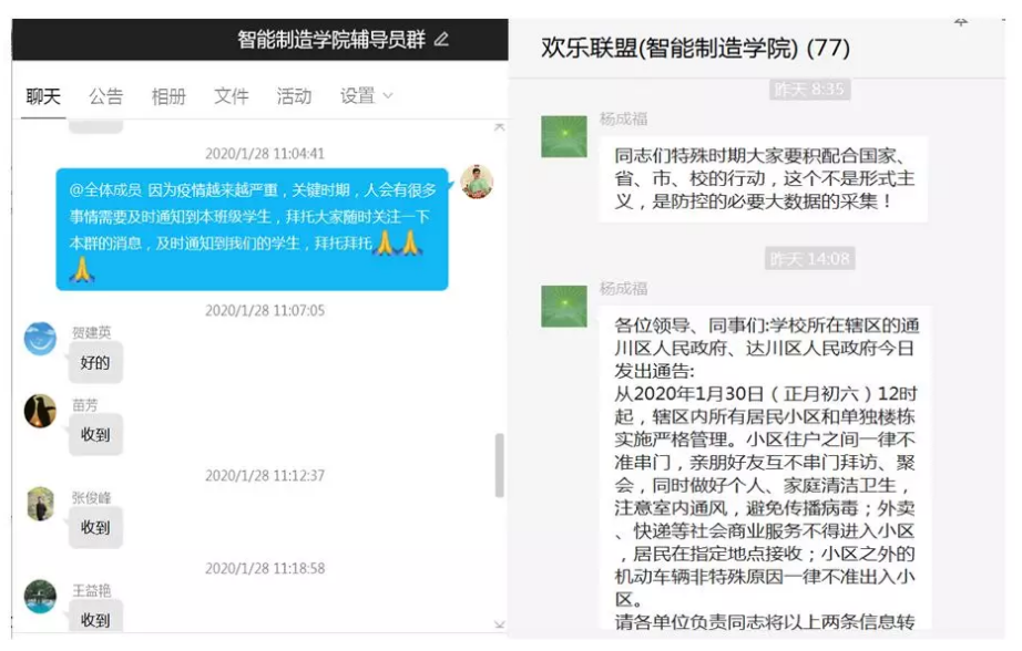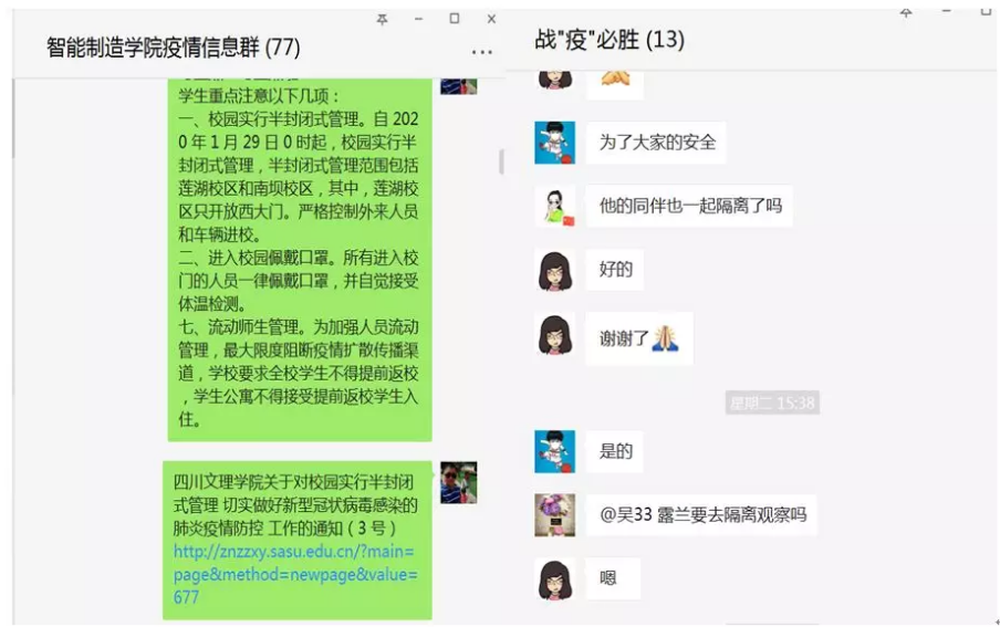 自1月23日开始,各班级辅导员就陆续将公司有关疫情防控工作的文件、材料等通过班级QQ群和微信群传达到员工,申明事件严重性;公司将各班班长团支书集中到“伟德国际victor1946疫情信息群”,积极发布官方信息,根据疫情防控进展情况,同步开展病毒防治知识宣传和教育引导工作,做到所有员工全覆盖。