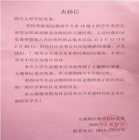 6月1日,公司收到一封来自乐山市五通桥区桥兴社区党委寄来的表扬信。信中,对公司2018级1班物理学专业员工邓霞同学在抗“疫”期间的良好表现给予肯定和表扬。同时,也对伟德国际victor1946为社会培养出具有新时代社会责任感的好员工表示感谢。