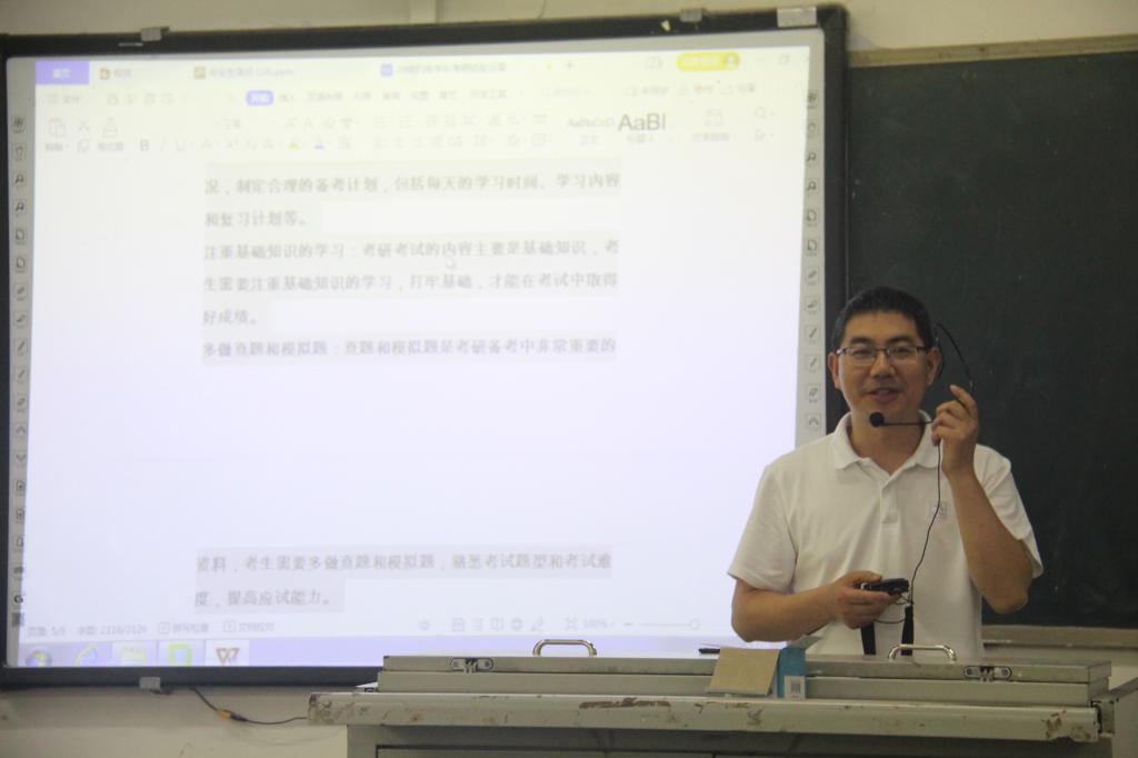 本次大会一共分为三项。第一项由员工代表为修业班同学献花。献花仪式意在表达同学们对师兄师姐的祝贺与敬佩。大会第二项为考研经验分享。此环节由邱建高优秀学子分享考研经验。邱建高就院校选择、备考时间安排、考试科目准备、踩过的坑、减压方式、心态调整等几方面为大家讲述自己的经验与见解。其中他觉得院校的选择要至关重要,一定要先了解目标院校的各种方面后再做决定,正所谓考得好不如选的好。而就如何选择课程老师这个问题,他们表示适合自己的才是最好的,要根据自身情况去考虑网课老师。然后从考研上岸的例子,让同学们了解更多院校,且为同学们提高信心。大会第三项是由曾强老师进行的宣讲。他表示考研不像大家想象的那么难,要先选好想考的公司并分清楚自己要考方向,再去做准备。从往届的考研数据分析,告诉准备考研的同学,考研虽有难度,但只要有付出就一定有收获,所以极力推荐大家去尝试。