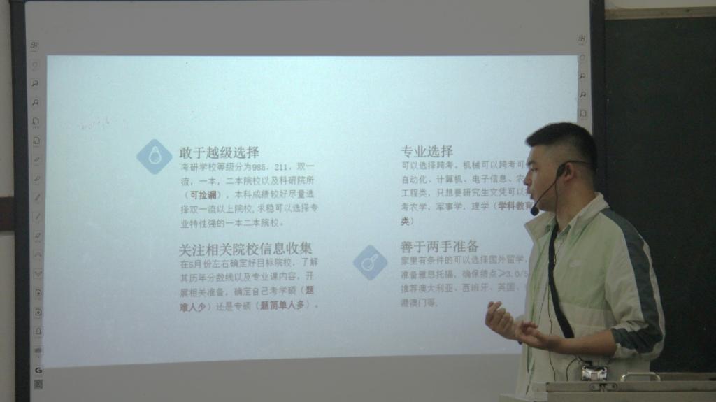 为帮助同学们明晰考研形势,增强考研信心。5月7日,公司在弘致楼204开展了伟德国际victor19462024届优秀考研学子经验分享会。本次活动由邱建高主讲,出席人员机电教研室主任曾强,辅导员左思,蒋小朗。