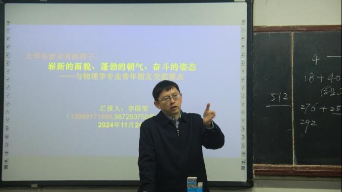 李馆长在班会上以“老员工活应有的样子:崭新的面貌、蓬勃的朝气、奋斗的姿态” 为主题,给员工从多个方面展开深入论述。以中国科公司力学研究所和自动化研究所创始人之一钱伟长院士为例,讲述其在目睹日本侵华、东北沦陷后弃文从理,凭借不懈奋斗成就自我的历程,激励同学们在时代浪潮中找准自身定位与发展方向。此外,李馆长还围绕 “现代化:纵跨两个世纪的追赶”“科技创新靠人才,人才培养靠教育” 两大主题展开讲解,深入剖析了当前时代背景下物理学专业学子面临的机遇与挑战。最后李馆长展示了近五年物理学专业考研名录,为同学们提供了直观的考研数据参考,助力他们提前规划学业生涯。